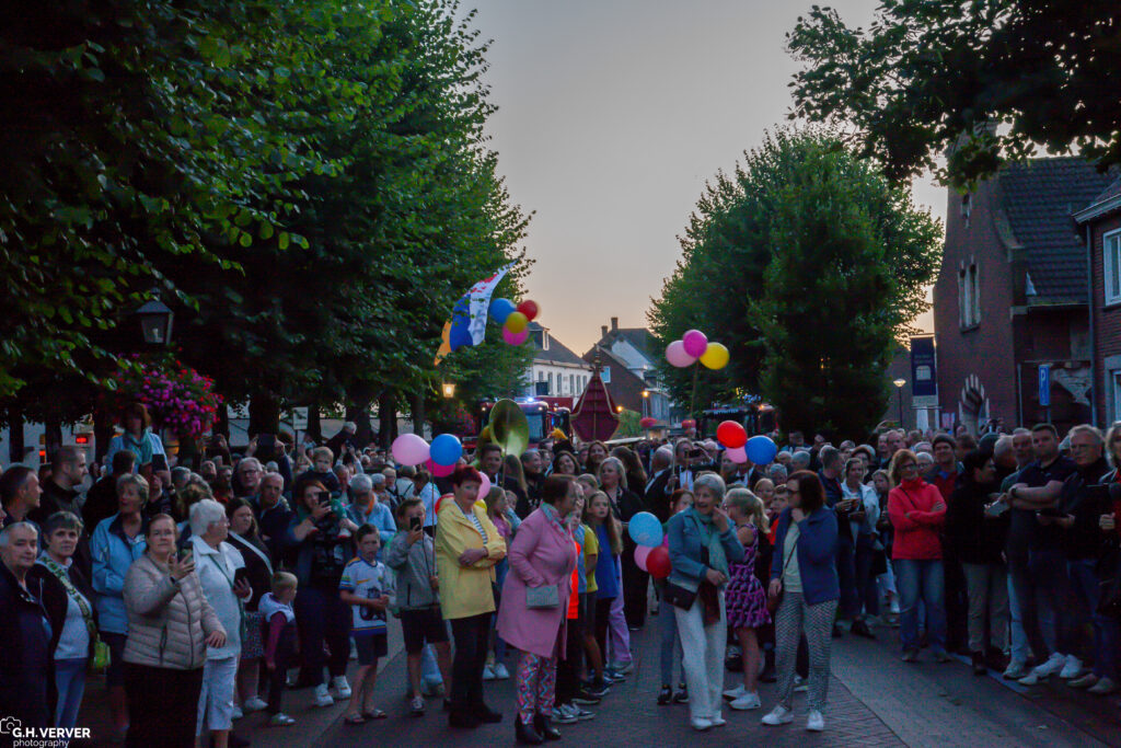 De huldiging in de tent was prachtig. Op het podium ontvingen Tim, Esther, Jeanine, Vivian, Huub en Jos d’n Um die vervolgens vol trots door Ton en Har naar buiten werd gedragen. Met de Esprit die door alle muzikanten in de tent werd gespeeld, was ook dit weer een waar kippenvelmoment.